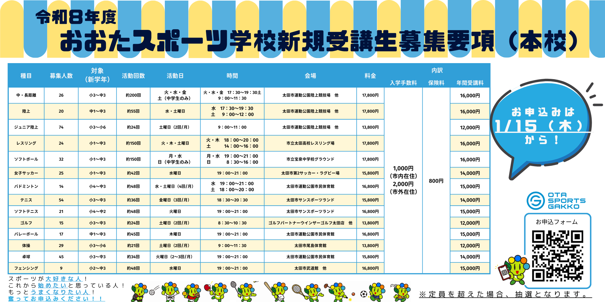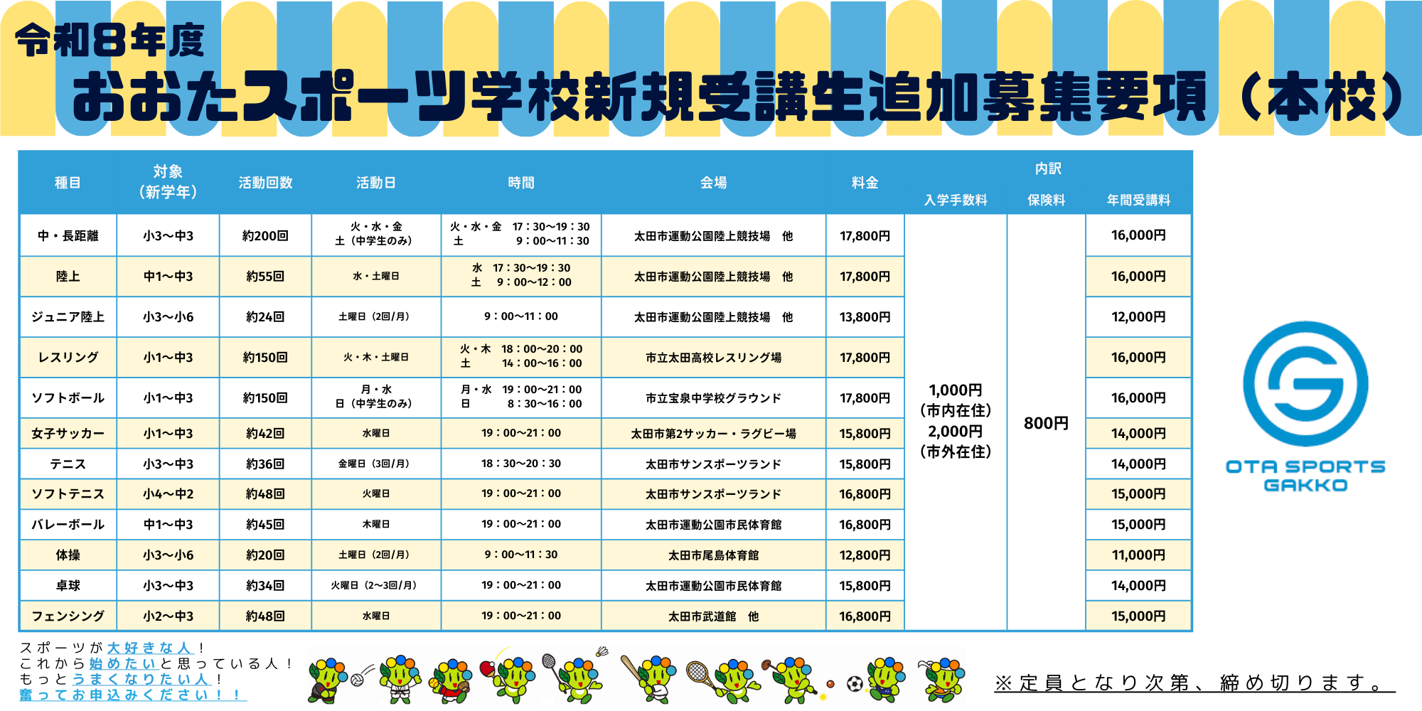 おおたスポーツ学校はジュニアスポーツの強化育成支援の一環として、少子化に伴う部活動諸問題への支援と学校週5日制を踏まえ、スポーツを通じた子どもたちの活動環境の提案を目的として平成12年6月に開校しました。 フォローよろしくお願いします🌟